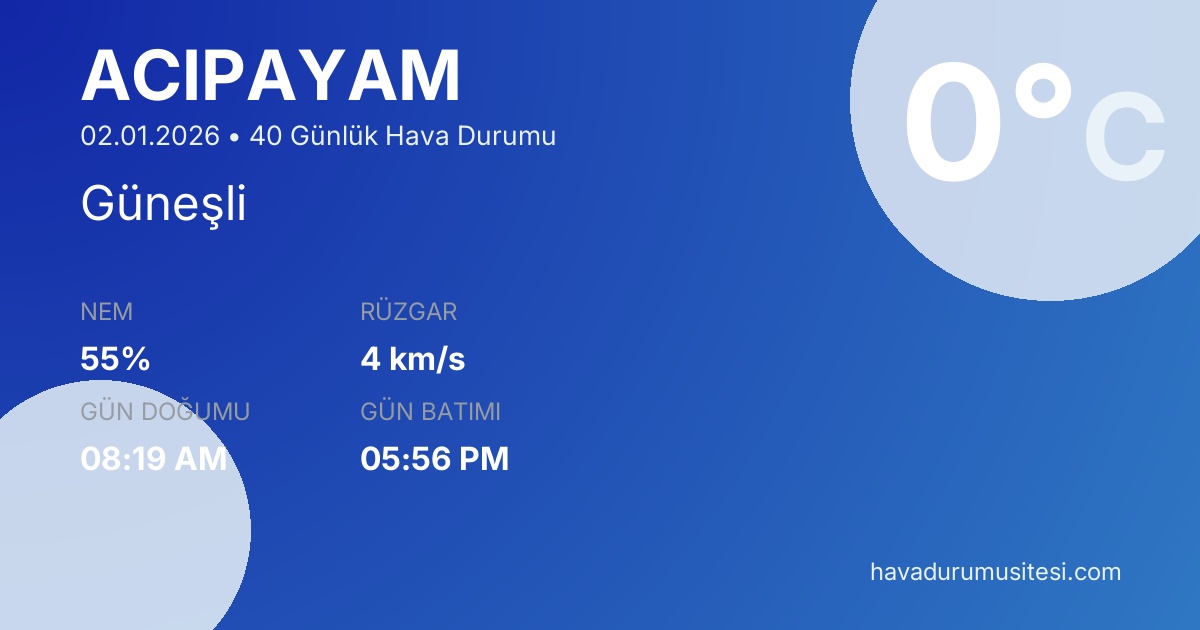 Acipayam için 40 günlük hava durumu tahminleri. Acipayam için güncel meteoroloji bilgileri, bugünkü hava durumu, yarınki tahmin ve 48 saatlik saatlik analiz sayfalarımızda detaylı bilgiler bulunmaktadır.