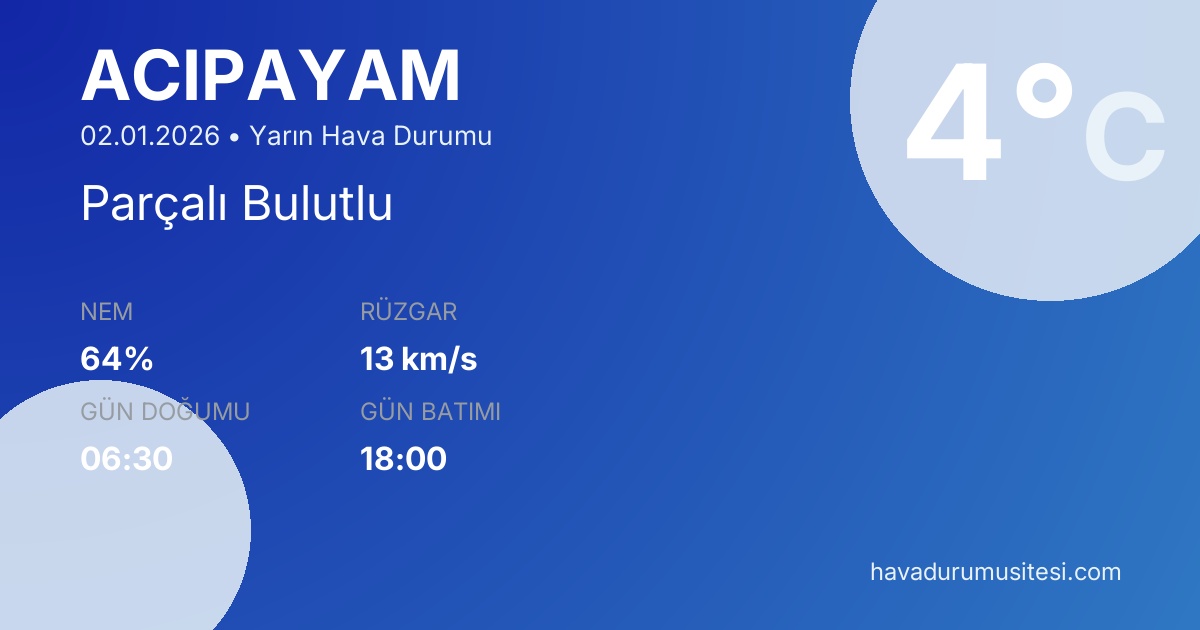 Acipayam yarın hava durumu tahminleri düzenli olarak güncellenmektedir. Meteoroloji verileri güvenilir kaynaklardan alınmakta ve sürekli güncellenmektedir. Son güncelleme: 02.01.2026 22:49