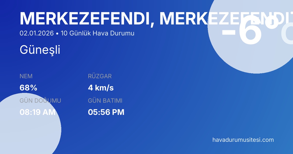 Merkezefendi̇ için 10 günlük detaylı hava durumu tahmini. Son güncelleme: 02.01.2026 13:55 | Veriler uluslararası meteoroloji standartlarına uygun olarak işlenmektedir.
