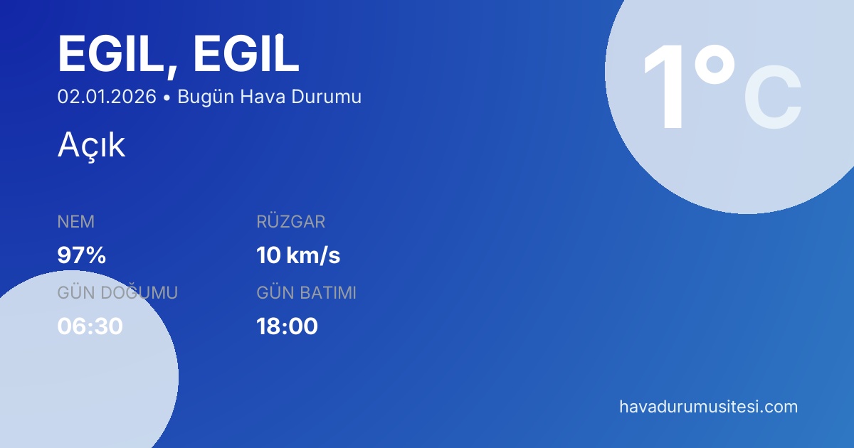 Eği̇l bugün hava durumu tahminleri düzenli olarak güncellenmektedir. 7 günlük haftalık tahmin ve 30 günlük uzun vadeli tahmin sayfalarımız ile farklı zaman dilimleri için planlama yapabilirsiniz. Meteoroloji verileri güvenilir kaynaklardan alınmakta ve sürekli güncellenmektedir. Son güncelleme: 02.01.2026 13:40