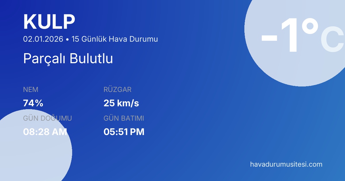 Kulp için 15 günlük detaylı hava durumu tahmini. Son güncelleme: 02.01.2026 07:54 | Veriler uluslararası meteoroloji standartlarına uygun olarak işlenmektedir.
