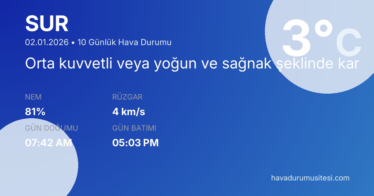Sur için 10 günlük hava durumu tahminleri. Şu anda sıcaklık 3°C ve hava durumu Orta kuvvetli veya yoğun ve sağnak şeklinde kar. Hissedilen sıcaklık 3°C. Nem oranı %81. Rüzgar hızı 4 km/s. Sur için güncel meteoroloji bilgileri, bugünkü hava durumu, yarınki tahmin ve 48 saatlik saatlik analiz sayfalarımızda detaylı bilgiler bulunmaktadır.