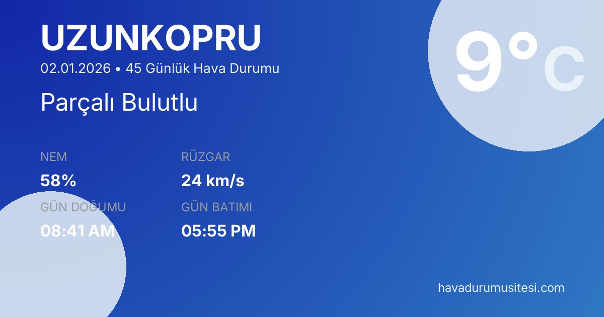 Önümüzdeki 45 gün boyunca sıcaklıkların -2°C ile 18°C arasında seyretmesi beklenmektedir. 8 gün yağışlı geçecek. 16 gün güneşli hava beklenmektedir. Uzunköprü hava durumu tahminleri düzenli olarak güncellenmektedir. Meteoroloji verileri güvenilir kaynaklardan alınmakta ve sürekli güncellenmektedir. Son güncelleme: 02.01.2026 15:19