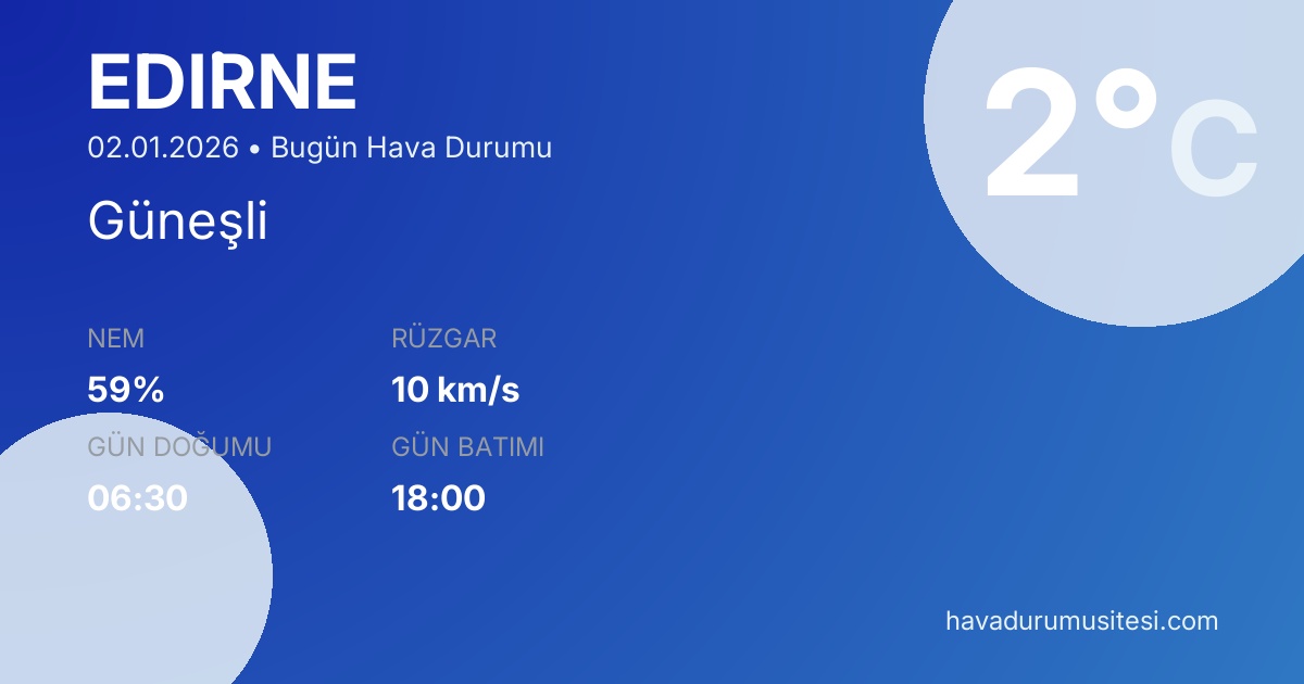 Edi̇rne bugün hava durumu tahminleri düzenli olarak güncellenmektedir. 7 günlük haftalık tahmin ve 30 günlük uzun vadeli tahmin sayfalarımız ile farklı zaman dilimleri için planlama yapabilirsiniz. Meteoroloji verileri güvenilir kaynaklardan alınmakta ve sürekli güncellenmektedir. Son güncelleme: 02.01.2026 11:44