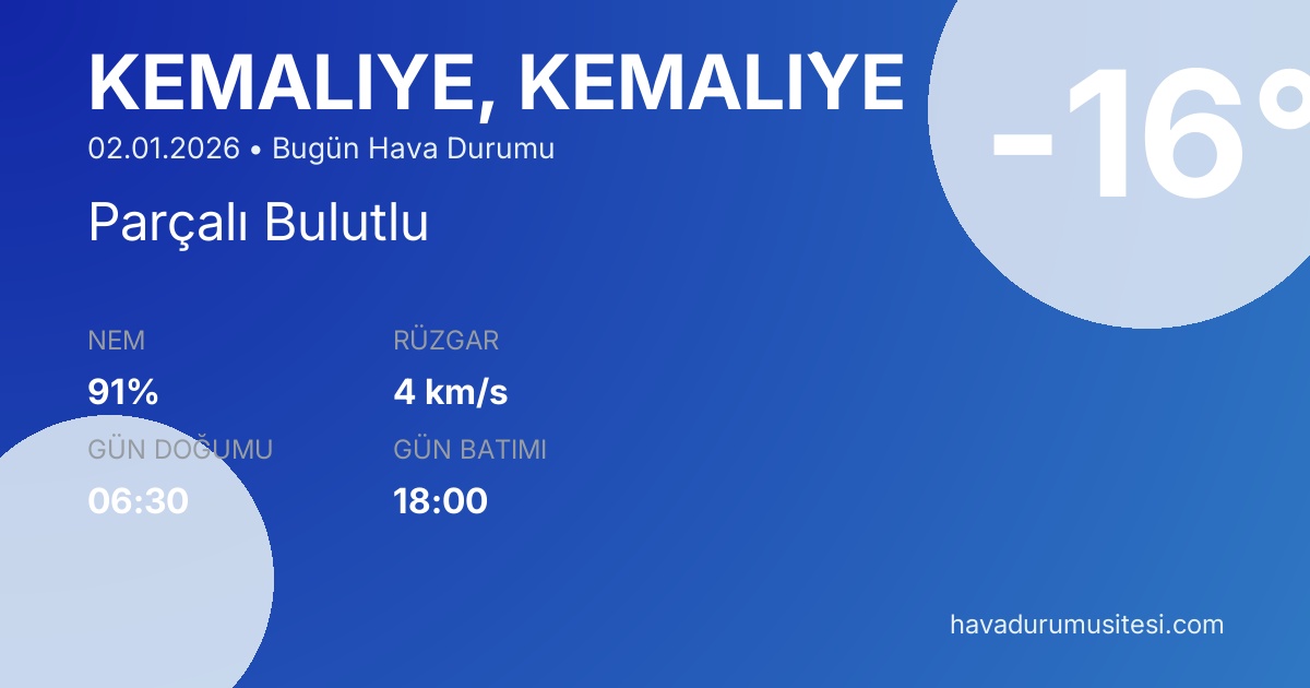 Kemali̇ye bugün hava durumu tahminleri düzenli olarak güncellenmektedir. 7 günlük haftalık tahmin ve 30 günlük uzun vadeli tahmin sayfalarımız ile farklı zaman dilimleri için planlama yapabilirsiniz. Meteoroloji verileri güvenilir kaynaklardan alınmakta ve sürekli güncellenmektedir. Son güncelleme: 02.01.2026 10:12