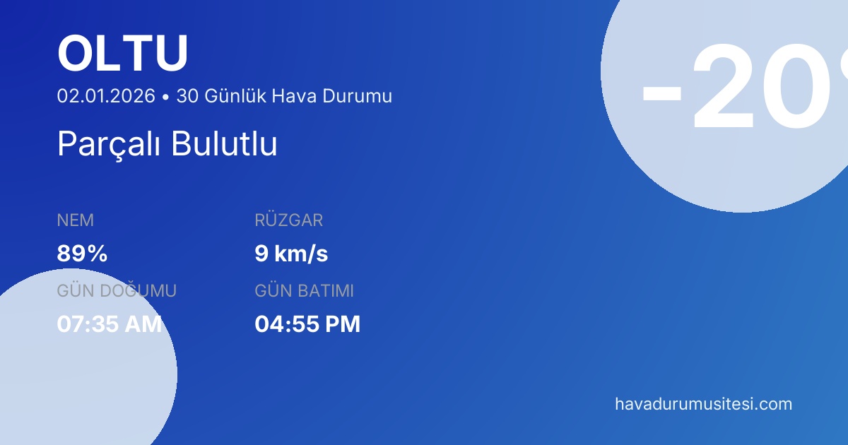 Önümüzdeki 30 gün boyunca sıcaklıkların -22°C ile 6°C arasında seyretmesi beklenmektedir. 5 gün yağışlı geçecek. 8 gün güneşli hava beklenmektedir. Oltu hava durumu tahminleri düzenli olarak güncellenmektedir. Meteoroloji verileri güvenilir kaynaklardan alınmakta ve sürekli güncellenmektedir. Son güncelleme: 02.01.2026 19:02