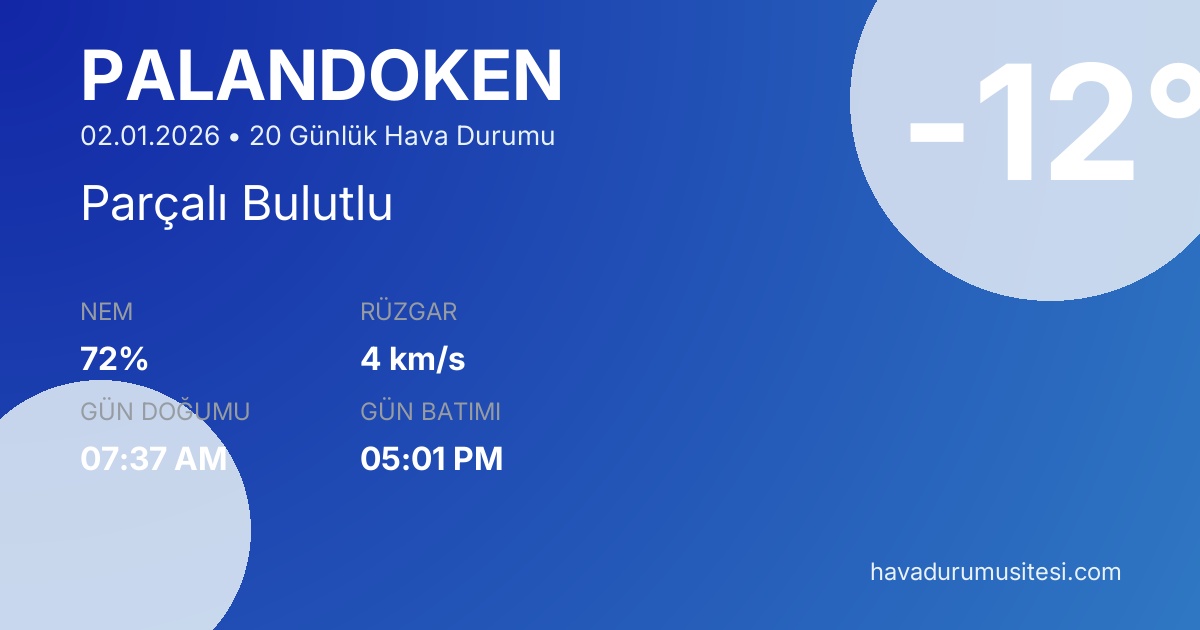 Önümüzdeki 20 gün boyunca sıcaklıkların -20°C ile 1°C arasında seyretmesi beklenmektedir. 4 gün yağışlı geçecek. Palandöken hava durumu tahminleri düzenli olarak güncellenmektedir. Meteoroloji verileri güvenilir kaynaklardan alınmakta ve sürekli güncellenmektedir. Son güncelleme: 02.01.2026 07:55
