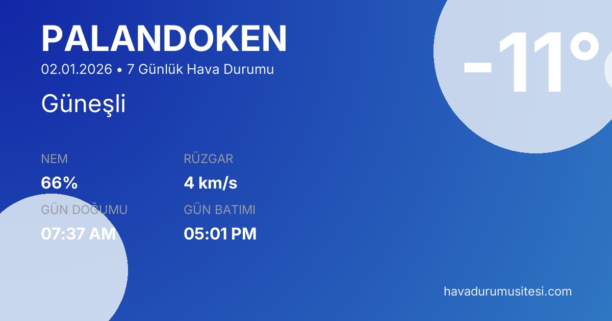 Palandöken için 7 günlük detaylı hava durumu tahmini. Son güncelleme: 02.01.2026 12:09 | Veriler uluslararası meteoroloji standartlarına uygun olarak işlenmektedir.