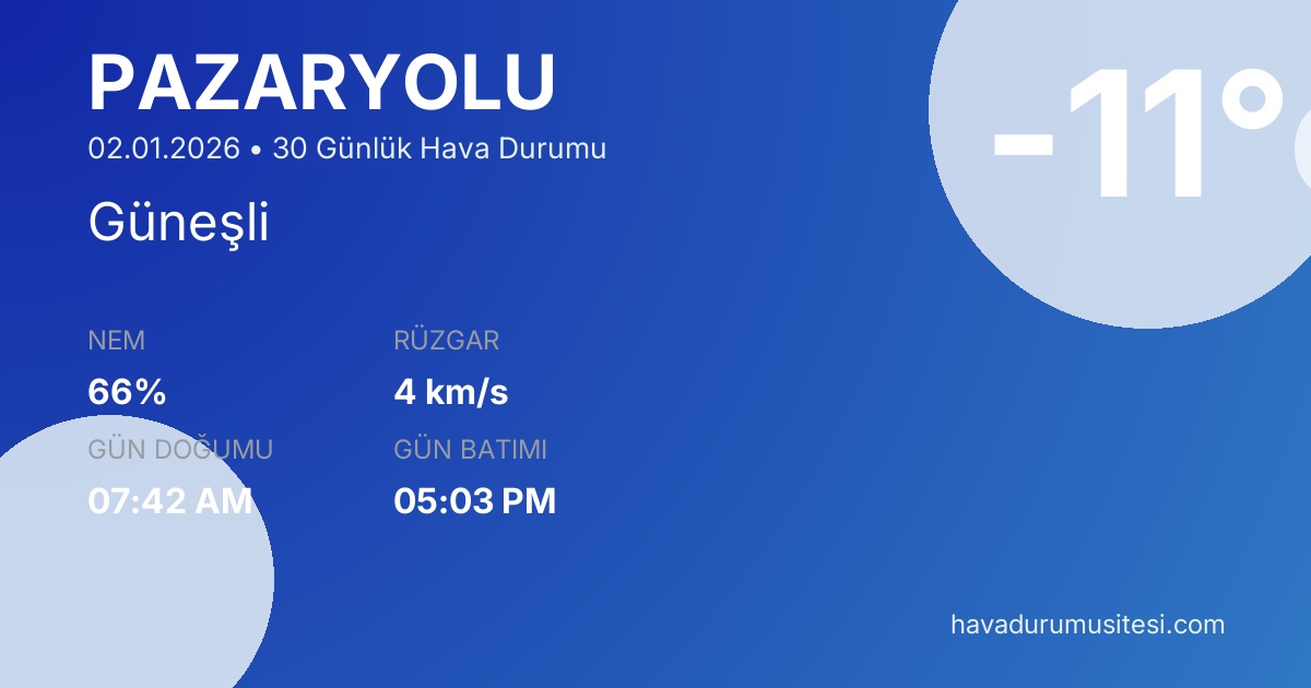 Önümüzdeki 30 gün boyunca sıcaklıkların -20°C ile 6°C arasında seyretmesi beklenmektedir. 6 gün yağışlı geçecek. Pazaryolu hava durumu tahminleri düzenli olarak güncellenmektedir. Meteoroloji verileri güvenilir kaynaklardan alınmakta ve sürekli güncellenmektedir. Son güncelleme: 02.01.2026 13:54