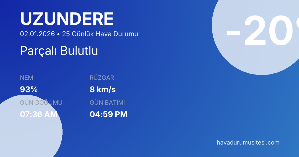 Önümüzdeki 25 gün boyunca sıcaklıkların -16°C ile 9°C arasında seyretmesi beklenmektedir. 10 gün yağışlı geçecek. 3 gün güneşli hava beklenmektedir. Uzundere hava durumu tahminleri düzenli olarak güncellenmektedir. Meteoroloji verileri güvenilir kaynaklardan alınmakta ve sürekli güncellenmektedir. Son güncelleme: 02.01.2026 17:32