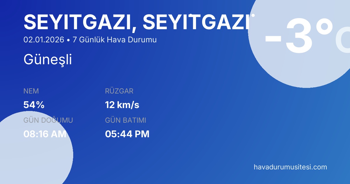 Seyi̇tgazi̇ için 7 günlük detaylı hava durumu tahmini. Son güncelleme: 02.01.2026 15:47 | Veriler uluslararası meteoroloji standartlarına uygun olarak işlenmektedir.
