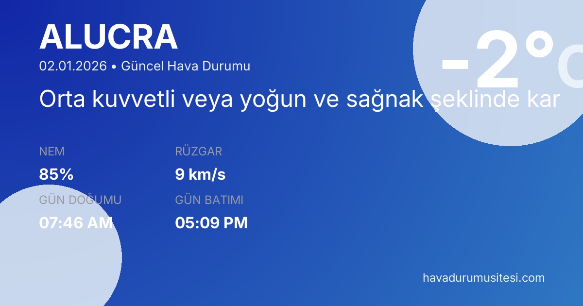 Alucra ilçesi için hava durumu tahminleri düzenli olarak güncellenmektedir. Saatlik hava durumu takibi ile gün içi planlamalarınızı yapabilirsiniz. 30 günlük uzun vadeli tahminler ile aylık planlamalarınızı yapabilirsiniz. Ayrıca 7 günlük ve 10 günlük tahminler ile haftalık planlamalarınızı yapabilirsiniz. Meteoroloji verileri güvenilir kaynaklardan alınmakta ve sürekli güncellenmektedir. Son güncelleme: 02.01.2026 09:42