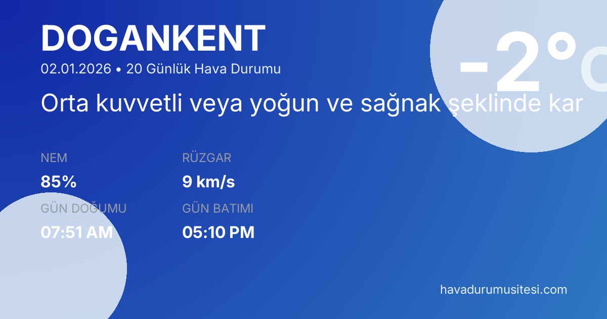 Doğankent için 20 günlük detaylı hava durumu tahmini. Son güncelleme: 02.01.2026 10:02 | Veriler uluslararası meteoroloji standartlarına uygun olarak işlenmektedir.