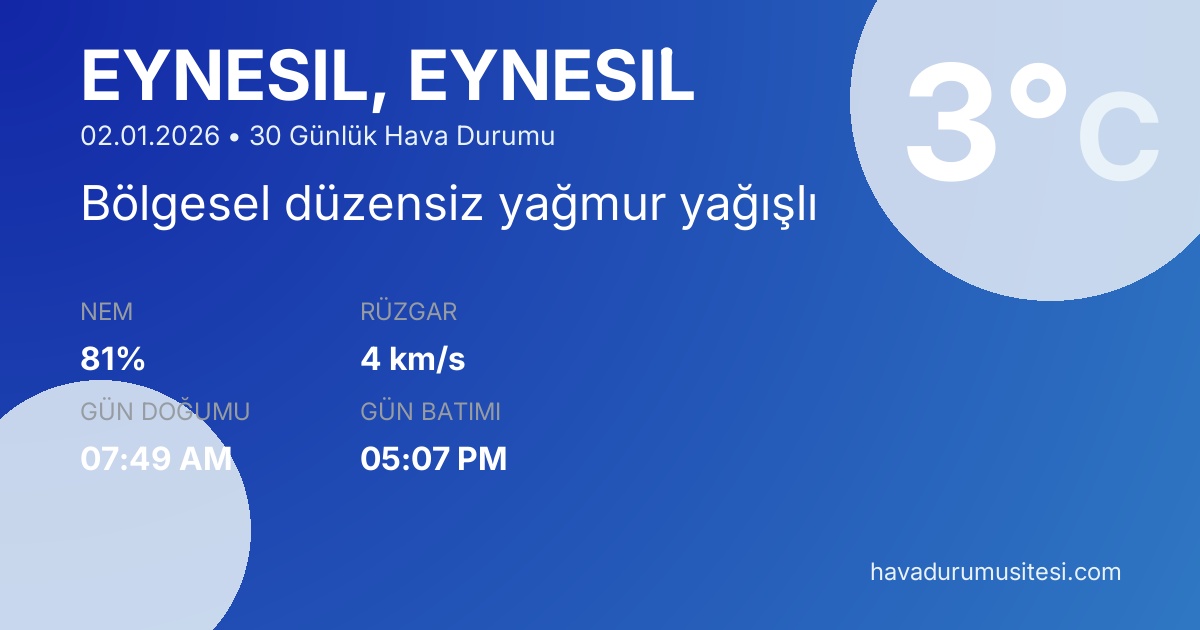 Eynesi̇l için 30 günlük detaylı hava durumu tahmini. Son güncelleme: 02.01.2026 13:38 | Veriler uluslararası meteoroloji standartlarına uygun olarak işlenmektedir.