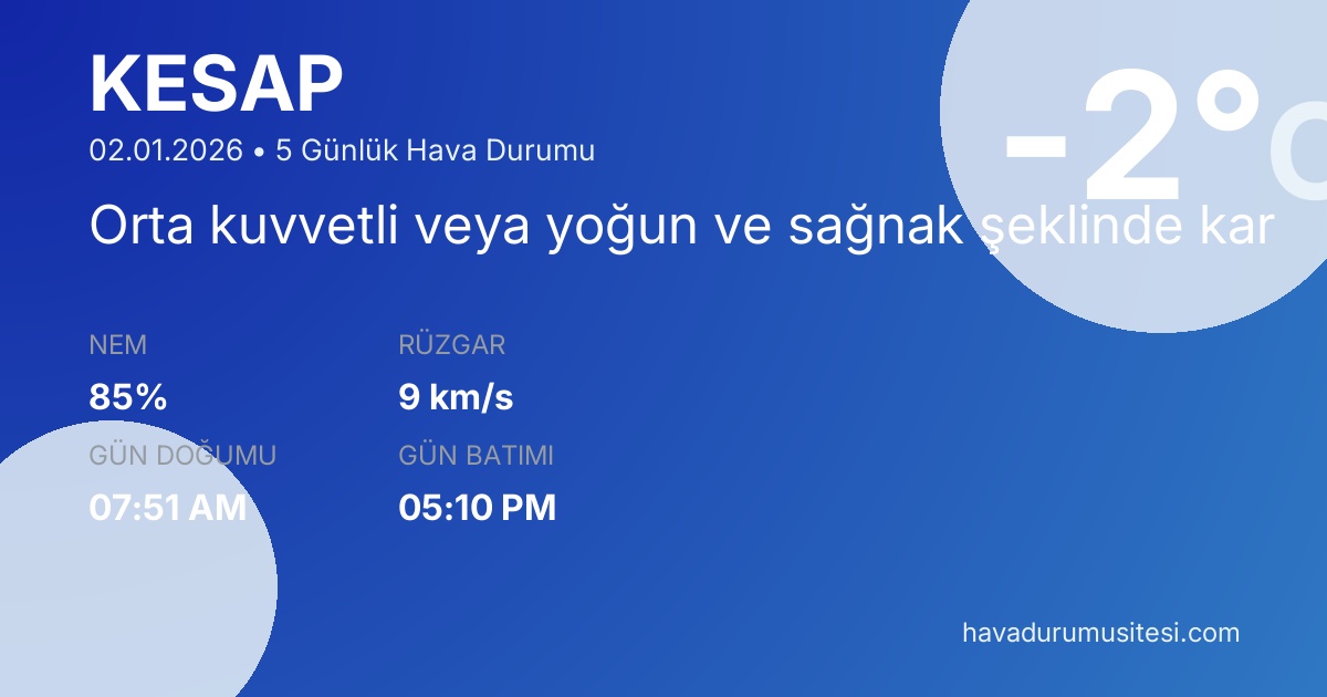 Keşap için 5 günlük hava durumu tahminleri. Şu anda sıcaklık -2°C ve hava durumu Orta kuvvetli veya yoğun ve sağnak şeklinde kar. Hissedilen sıcaklık -5°C. Nem oranı %85. Rüzgar hızı 9 km/s. Keşap için güncel meteoroloji bilgileri, bugünkü hava durumu, yarınki tahmin ve 48 saatlik saatlik analiz sayfalarımızda detaylı bilgiler bulunmaktadır.