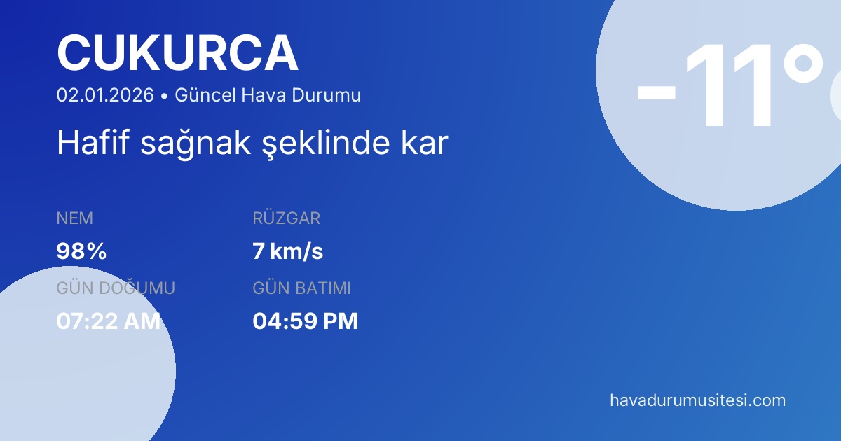 Çukurca ilçesi, Hakkari̇ iline bağlıdır. Şu anda sıcaklık -9°C ve hava durumu Orta kuvvetli veya yoğun ve sağnak şeklinde kar. Hissedilen sıcaklık -16°C. Nem oranı %98. Rüzgar hızı 14 km/s. Çukurca için bugün hava durumu, yarın hava durumu, 5 günlük tahmin ve 15 günlük tahmin sayfalarımızda detaylı bilgiler bulunmaktadır. Hakkari̇ 15 günlük tahmin ve Hakkari̇ 30 günlük tahmin sayfalarını da inceleyebilirsiniz.