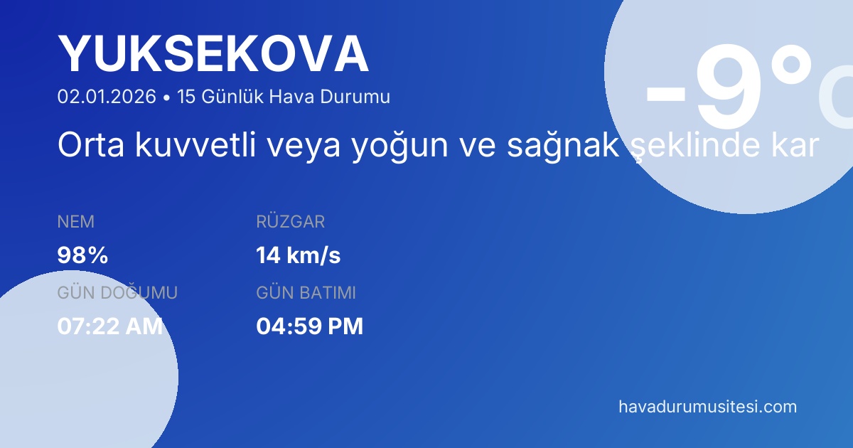 Önümüzdeki 15 gün boyunca Yüksekova ilçesinde sıcaklıkların -17°C ile 3°C arasında seyretmesi beklenmektedir. Ortalama sıcaklık -5°C civarında olacaktır. 8 gün güneşli ve açık hava koşulları hakim olacak. Yaklaşık 1 gün yağışlı geçmesi bekleniyor. Kış mevsiminin özelliklerini taşıyan bu dönemde hava durumu tahminlerini düzenli takip etmeniz önerilir.