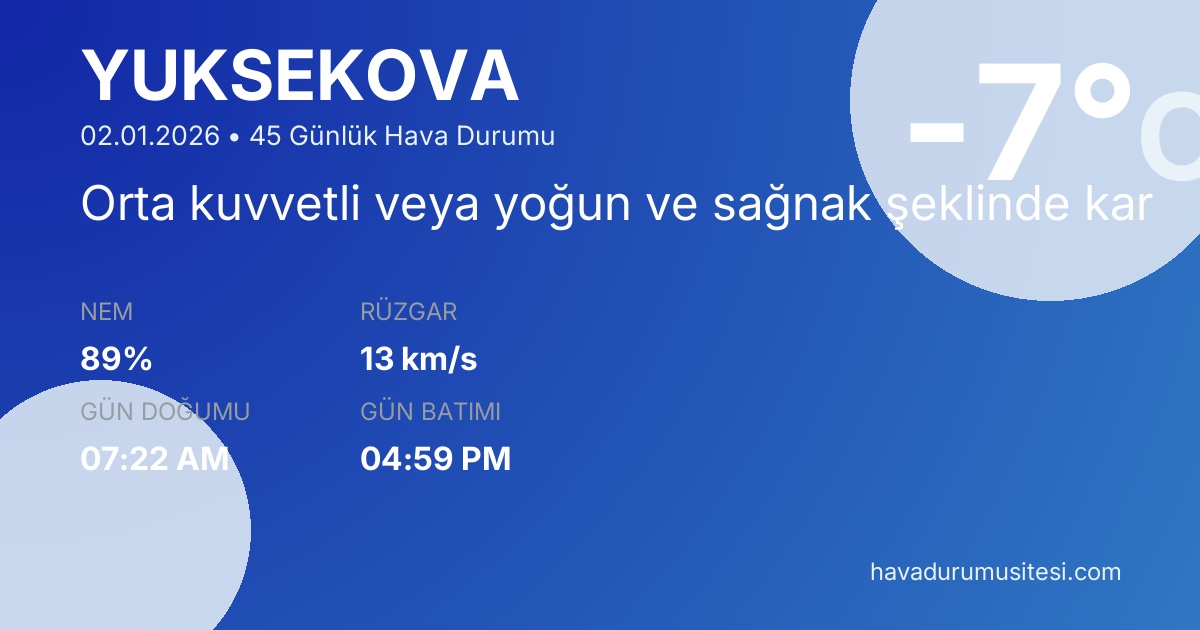Önümüzdeki 45 gün boyunca sıcaklıkların -17°C ile 4°C arasında seyretmesi beklenmektedir. 19 gün yağışlı geçecek. 10 gün güneşli hava beklenmektedir. Yüksekova hava durumu tahminleri düzenli olarak güncellenmektedir. Meteoroloji verileri güvenilir kaynaklardan alınmakta ve sürekli güncellenmektedir. Son güncelleme: 02.01.2026 13:51