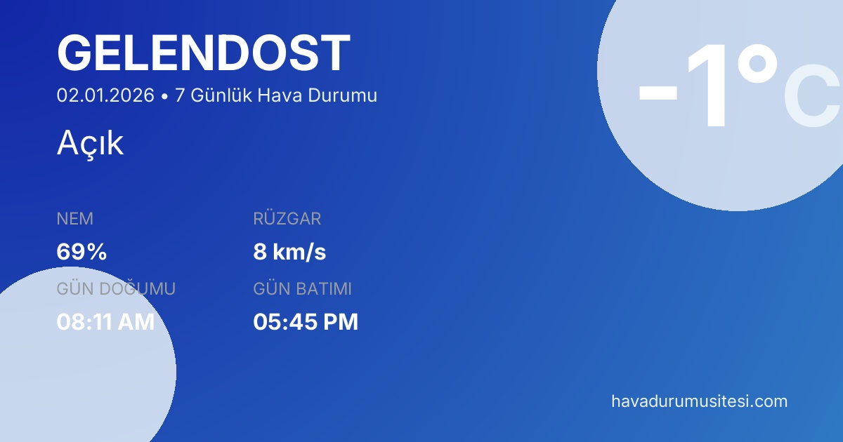 Gelendost için 7 günlük hava durumu tahminleri. Şu anda sıcaklık -1°C ve hava durumu Açık. Hissedilen sıcaklık -4°C. Nem oranı %69. Rüzgar hızı 8 km/s. Gelendost için güncel meteoroloji bilgileri, bugünkü hava durumu, yarınki tahmin ve 48 saatlik saatlik analiz sayfalarımızda detaylı bilgiler bulunmaktadır.