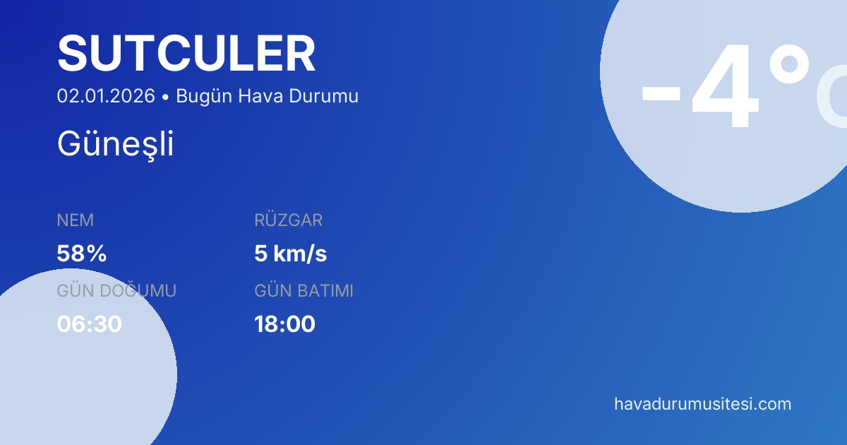 Sütçüler bugün hava durumu tahminleri düzenli olarak güncellenmektedir. 7 günlük haftalık tahmin ve 30 günlük uzun vadeli tahmin sayfalarımız ile farklı zaman dilimleri için planlama yapabilirsiniz. Meteoroloji verileri güvenilir kaynaklardan alınmakta ve sürekli güncellenmektedir. Son güncelleme: 02.01.2026 13:38