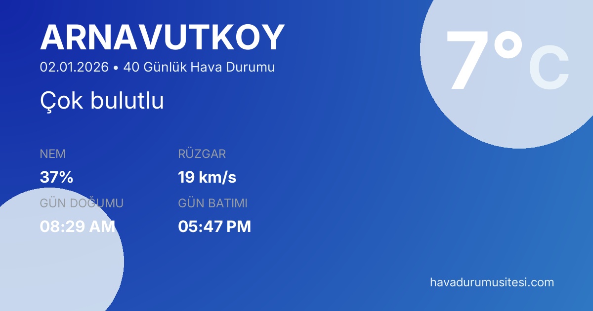 Arnavutköy için 40 günlük detaylı hava durumu tahmini. Son güncelleme: 02.01.2026 17:32 | Veriler uluslararası meteoroloji standartlarına uygun olarak işlenmektedir.