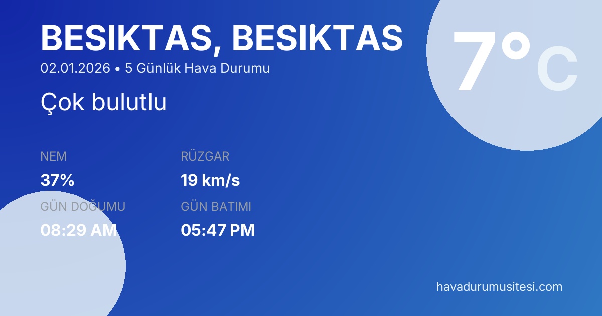 Beşi̇ktaş için 5 günlük detaylı hava durumu tahmini. Son güncelleme: 02.01.2026 17:32 | Veriler uluslararası meteoroloji standartlarına uygun olarak işlenmektedir.
