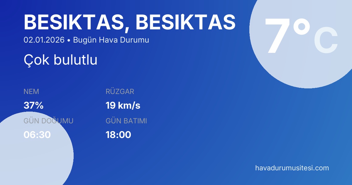 Beşi̇ktaş için bugünün hava durumu bilgileri. Şu anda sıcaklık 7°C ve hava durumu Çok bulutlu. Hissedilen sıcaklık 3°C. Nem oranı %37. Rüzgar hızı 19 km/s. Bugün sıcaklıkların 2°C ile 7°C arasında seyretmesi beklenmektedir. Beşi̇ktaş için hava durumu, yarın, 5 günlük, 15 günlük ve saatlik tahmin sayfalarımızda detaylı bilgiler bulunmaktadır. İstanbul ana sayfası ve İstanbul 15 günlük tahmin sayfalarını da inceleyebilirsiniz.