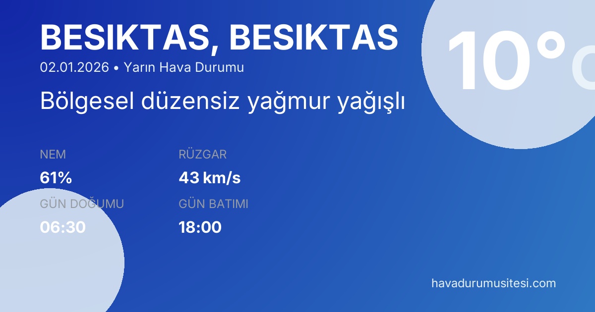 Beşi̇ktaş yarın hava durumu tahminleri düzenli olarak güncellenmektedir. Meteoroloji verileri güvenilir kaynaklardan alınmakta ve sürekli güncellenmektedir. Son güncelleme: 02.01.2026 09:26