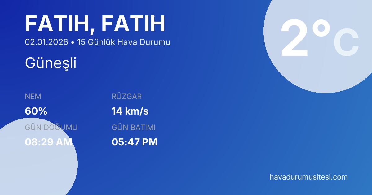 Fati̇h 15 günlük hava durumu tahminleri düzenli olarak güncellenmektedir. Meteoroloji verileri güvenilir kaynaklardan alınmakta ve sürekli güncellenmektedir. Son güncelleme: 02.01.2026 09:20