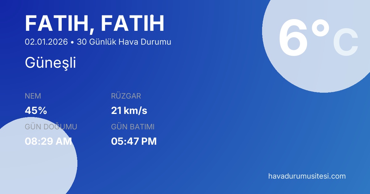 Fati̇h için 30 günlük hava durumu tahminleri. Şu anda sıcaklık 6°C ve hava durumu Güneşli. Hissedilen sıcaklık 2°C. Nem oranı %45. Rüzgar hızı 21 km/s. Fati̇h için güncel meteoroloji bilgileri, bugünkü hava durumu, yarınki tahmin ve 48 saatlik saatlik analiz sayfalarımızda detaylı bilgiler bulunmaktadır.