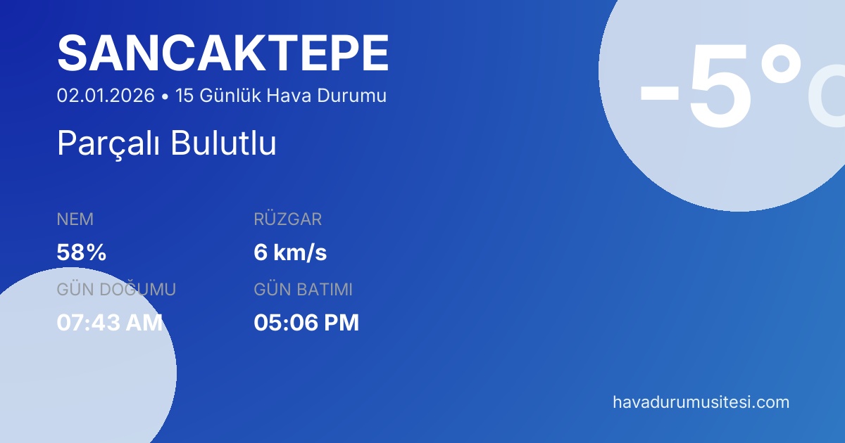 Önümüzdeki 15 gün boyunca Sancaktepe ilçesinde sıcaklıkların -1°C ile 18°C arasında seyretmesi beklenmektedir. Ortalama sıcaklık 9°C civarında olacaktır. 7 gün güneşli ve açık hava koşulları hakim olacak. Yaklaşık 2 gün yağışlı geçmesi bekleniyor. Kış mevsiminin özelliklerini taşıyan bu dönemde hava durumu tahminlerini düzenli takip etmeniz önerilir.