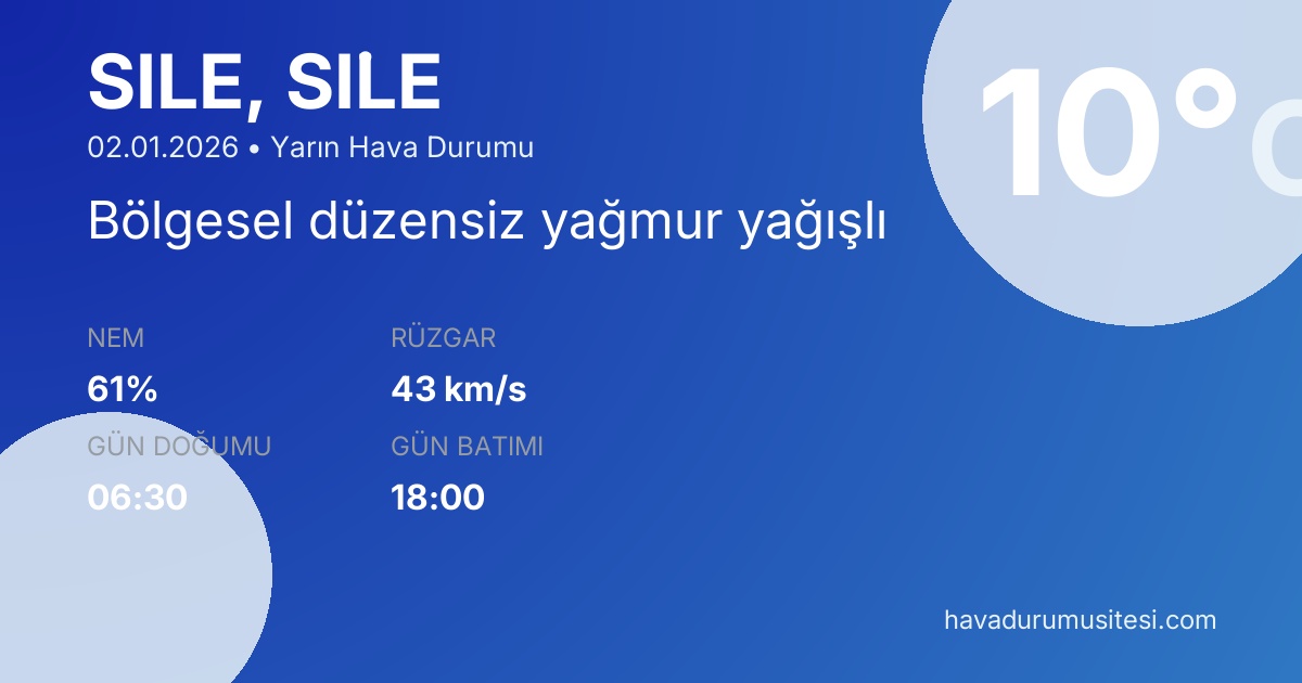 Şi̇le yarın hava durumu tahminleri düzenli olarak güncellenmektedir. Meteoroloji verileri güvenilir kaynaklardan alınmakta ve sürekli güncellenmektedir. Son güncelleme: 02.01.2026 07:22