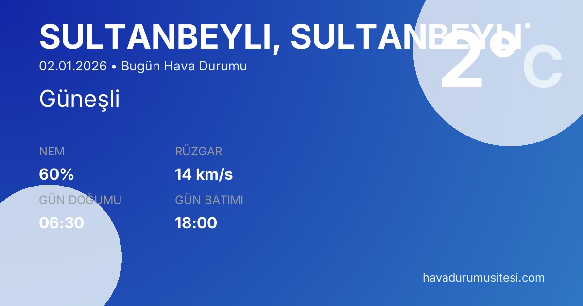 Sultanbeyli̇ bugün hava durumu tahminleri düzenli olarak güncellenmektedir. 7 günlük haftalık tahmin ve 30 günlük uzun vadeli tahmin sayfalarımız ile farklı zaman dilimleri için planlama yapabilirsiniz. Meteoroloji verileri güvenilir kaynaklardan alınmakta ve sürekli güncellenmektedir. Son güncelleme: 02.01.2026 09:41