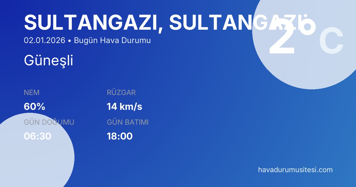 Sultangazi̇ bugün hava durumu tahminleri düzenli olarak güncellenmektedir. 7 günlük haftalık tahmin ve 30 günlük uzun vadeli tahmin sayfalarımız ile farklı zaman dilimleri için planlama yapabilirsiniz. Meteoroloji verileri güvenilir kaynaklardan alınmakta ve sürekli güncellenmektedir. Son güncelleme: 02.01.2026 10:12
