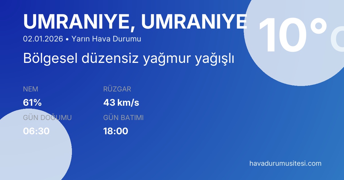 Ümrani̇ye için 03 Ocak 2026, Cumartesi günü detaylı hava durumu tahminleri. Yarın Ümrani̇ye'da sıcaklıkların 7°C ile 13°C arasında seyretmesi beklenmektedir. Hava durumu Bölgesel düzensiz yağmur yağışlı. Yağış ihtimali %74. Rüzgar hızı maksimum 43 km/s. Nem oranı ortalama %61. Yarın hava durumunu önceden bilmek, günlük hayatınızı planlamanıza yardımcı olur.