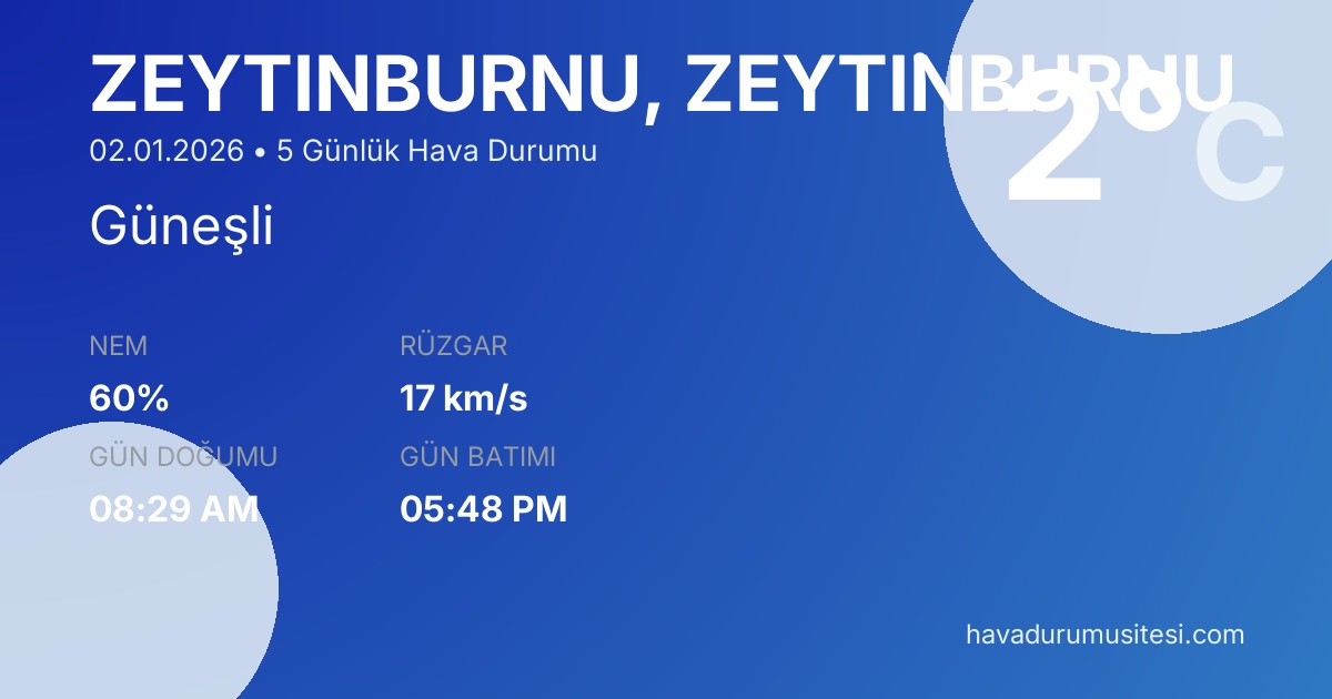 Zeyti̇nburnu için 5 günlük detaylı hava durumu tahmini. Son güncelleme: 02.01.2026 10:15 | Veriler uluslararası meteoroloji standartlarına uygun olarak işlenmektedir.