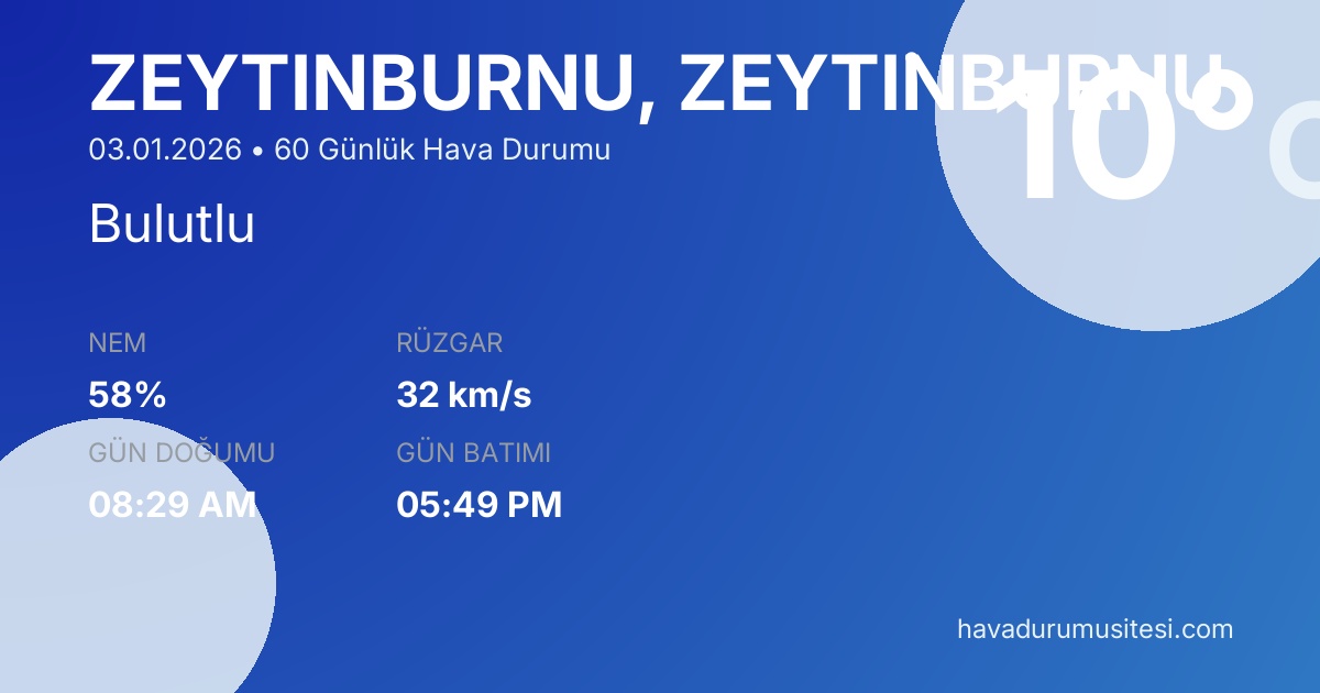 Zeyti̇nburnu için 60 günlük detaylı hava durumu tahmini. Son güncelleme: 03.01.2026 05:23 | Veriler uluslararası meteoroloji standartlarına uygun olarak işlenmektedir.