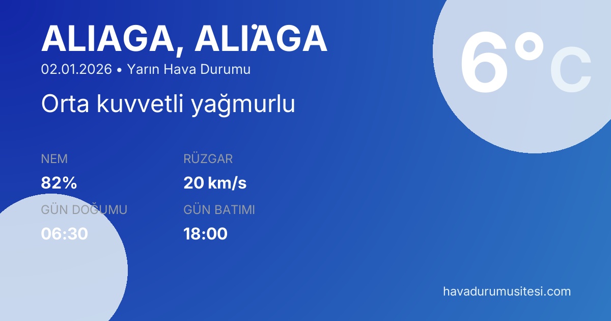 Ali̇ağa yarın hava durumu tahminleri düzenli olarak güncellenmektedir. Meteoroloji verileri güvenilir kaynaklardan alınmakta ve sürekli güncellenmektedir. Son güncelleme: 02.01.2026 07:22