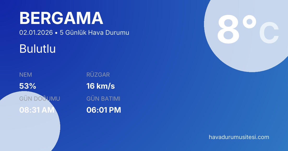 Bergama için 5 günlük detaylı hava durumu tahmini. Son güncelleme: 02.01.2026 15:23 | Veriler uluslararası meteoroloji standartlarına uygun olarak işlenmektedir.