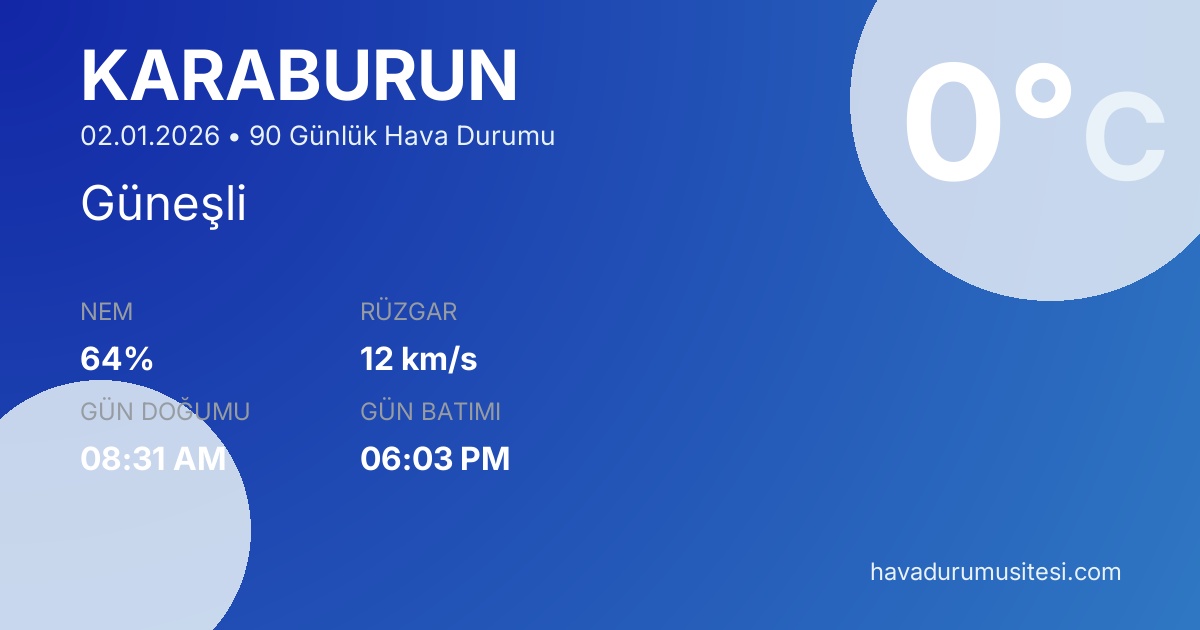 Karaburun için 90 günlük hava durumu tahminleri. Karaburun için güncel meteoroloji bilgileri, bugünkü hava durumu, yarınki tahmin ve 48 saatlik saatlik analiz sayfalarımızda detaylı bilgiler bulunmaktadır.