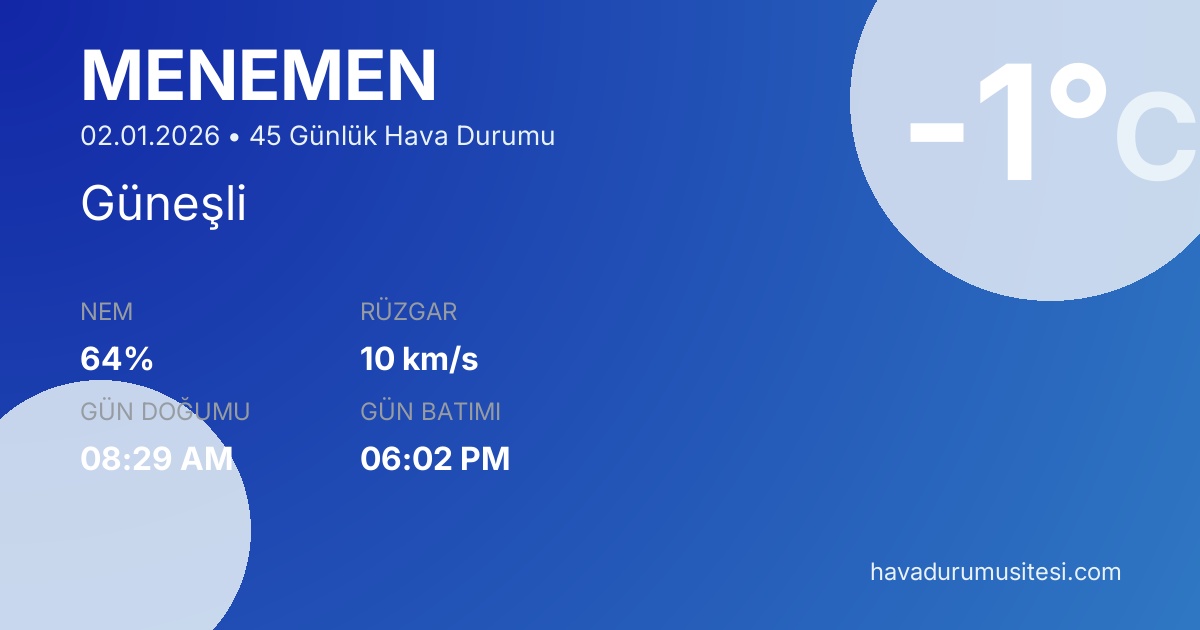 Önümüzdeki 45 gün boyunca sıcaklıkların -3°C ile 18°C arasında seyretmesi beklenmektedir. 12 gün yağışlı geçecek. 19 gün güneşli hava beklenmektedir. Menemen hava durumu tahminleri düzenli olarak güncellenmektedir. Meteoroloji verileri güvenilir kaynaklardan alınmakta ve sürekli güncellenmektedir. Son güncelleme: 02.01.2026 12:10