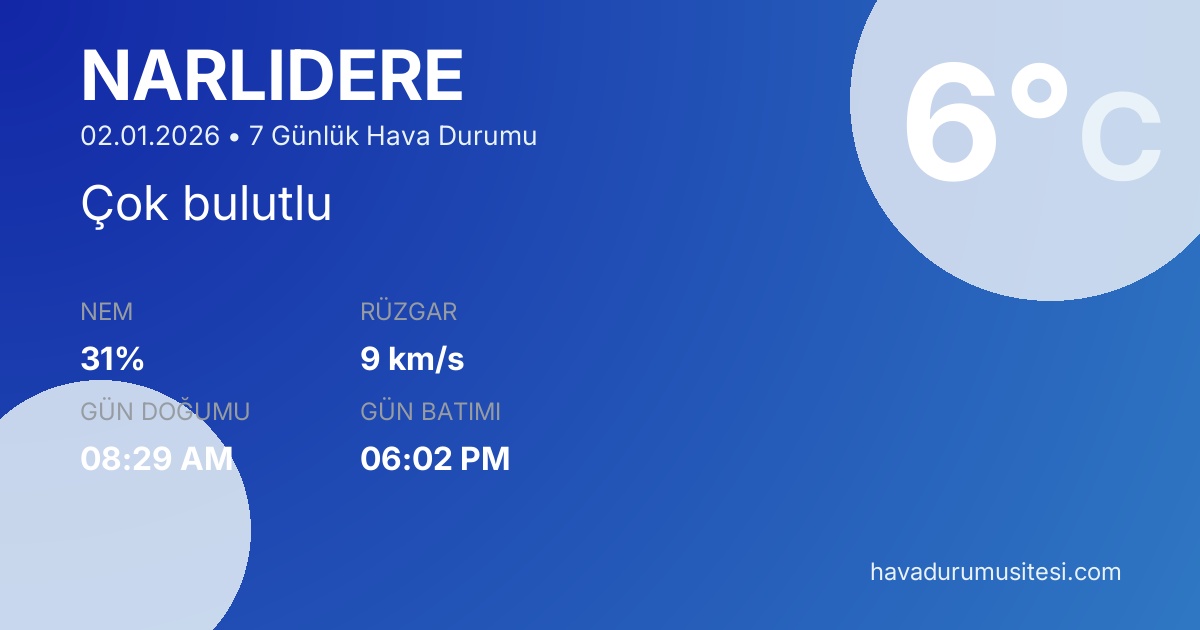 Önümüzdeki 7 gün boyunca sıcaklıkların -1°C ile 17°C arasında seyretmesi beklenmektedir. 3 gün yağışlı geçecek. 1 gün güneşli hava beklenmektedir. Narlidere hava durumu tahminleri düzenli olarak güncellenmektedir. Meteoroloji verileri güvenilir kaynaklardan alınmakta ve sürekli güncellenmektedir. Son güncelleme: 02.01.2026 17:31