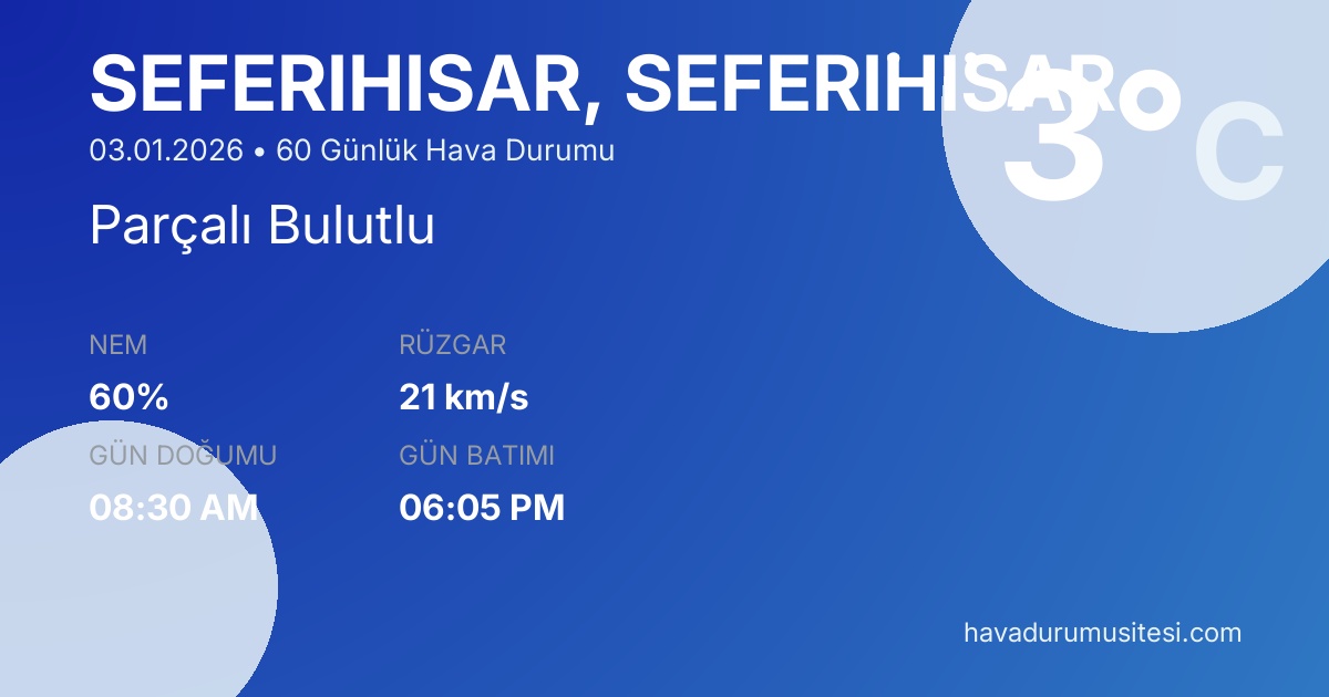 Seferi̇hi̇sar için 60 günlük detaylı hava durumu tahmini. Son güncelleme: 03.01.2026 05:26 | Veriler uluslararası meteoroloji standartlarına uygun olarak işlenmektedir.