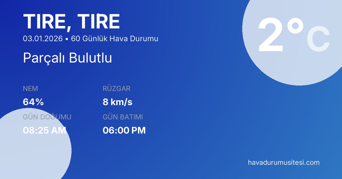 Ti̇re için 60 günlük detaylı hava durumu tahmini. Son güncelleme: 03.01.2026 05:20 | Veriler uluslararası meteoroloji standartlarına uygun olarak işlenmektedir.