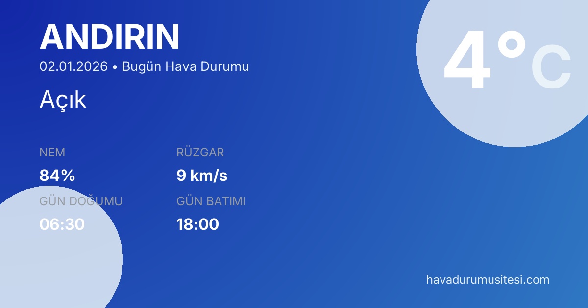 Andirin bugün hava durumu tahminleri düzenli olarak güncellenmektedir. 7 günlük haftalık tahmin ve 30 günlük uzun vadeli tahmin sayfalarımız ile farklı zaman dilimleri için planlama yapabilirsiniz. Meteoroloji verileri güvenilir kaynaklardan alınmakta ve sürekli güncellenmektedir. Son güncelleme: 02.01.2026 09:42