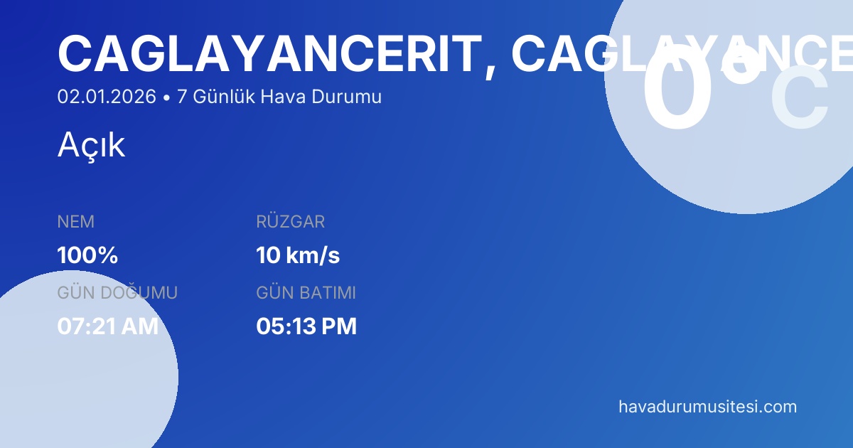 Çağlayanceri̇t için 7 günlük detaylı hava durumu tahmini. Son güncelleme: 02.01.2026 11:38 | Veriler uluslararası meteoroloji standartlarına uygun olarak işlenmektedir.