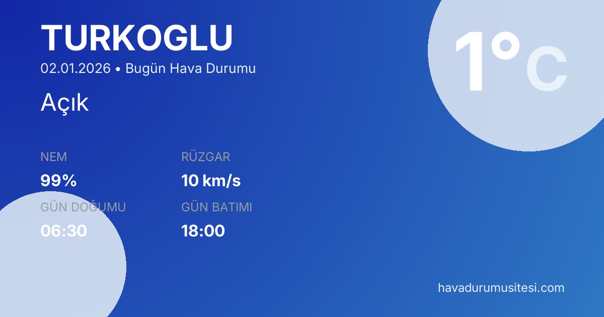 Türkoğlu bugün hava durumu tahminleri düzenli olarak güncellenmektedir. 7 günlük haftalık tahmin ve 30 günlük uzun vadeli tahmin sayfalarımız ile farklı zaman dilimleri için planlama yapabilirsiniz. Meteoroloji verileri güvenilir kaynaklardan alınmakta ve sürekli güncellenmektedir. Son güncelleme: 02.01.2026 13:36