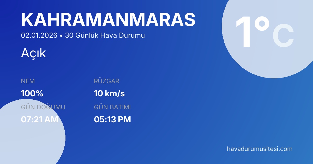 Kahramanmaraş için 30 günlük hava durumu tahminleri. Şu anda sıcaklık 4°C ve hava durumu Açık. Hissedilen sıcaklık 2°C. Nem oranı %84. Rüzgar hızı 9 km/s. Kahramanmaraş için güncel meteoroloji bilgileri, bugünkü hava durumu, yarınki tahmin ve 48 saatlik saatlik analiz sayfalarımızda detaylı bilgiler bulunmaktadır.