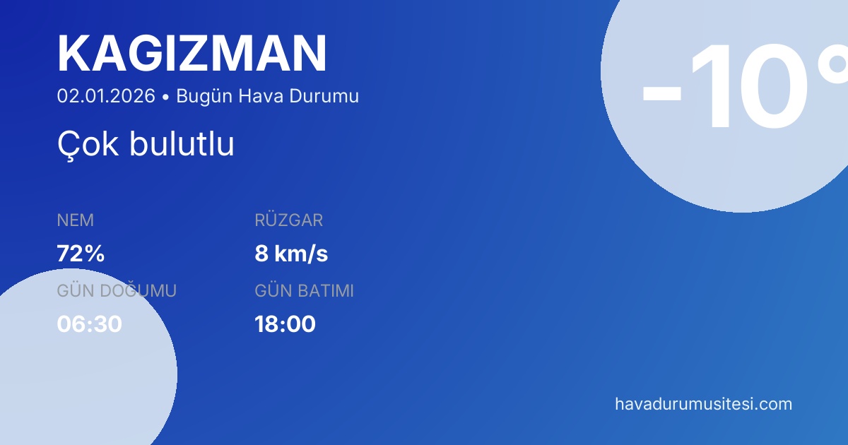 Kağizman bugün hava durumu tahminleri düzenli olarak güncellenmektedir. 7 günlük haftalık tahmin ve 30 günlük uzun vadeli tahmin sayfalarımız ile farklı zaman dilimleri için planlama yapabilirsiniz. Meteoroloji verileri güvenilir kaynaklardan alınmakta ve sürekli güncellenmektedir. Son güncelleme: 02.01.2026 07:49