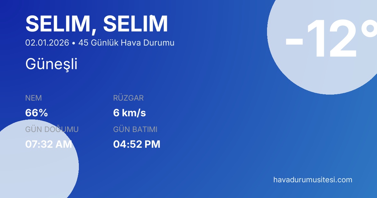 Seli̇m için 45 günlük detaylı hava durumu tahmini. Son güncelleme: 02.01.2026 15:15 | Veriler uluslararası meteoroloji standartlarına uygun olarak işlenmektedir.